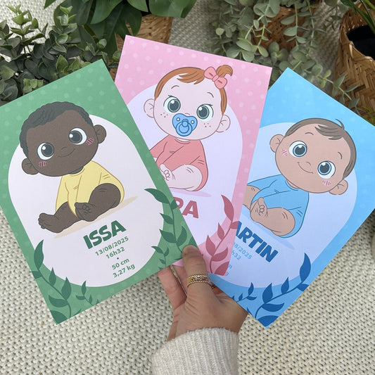 Choisissez le prénom, les couleurs, les accessoires ou le style de l’illustration selon vos envies.